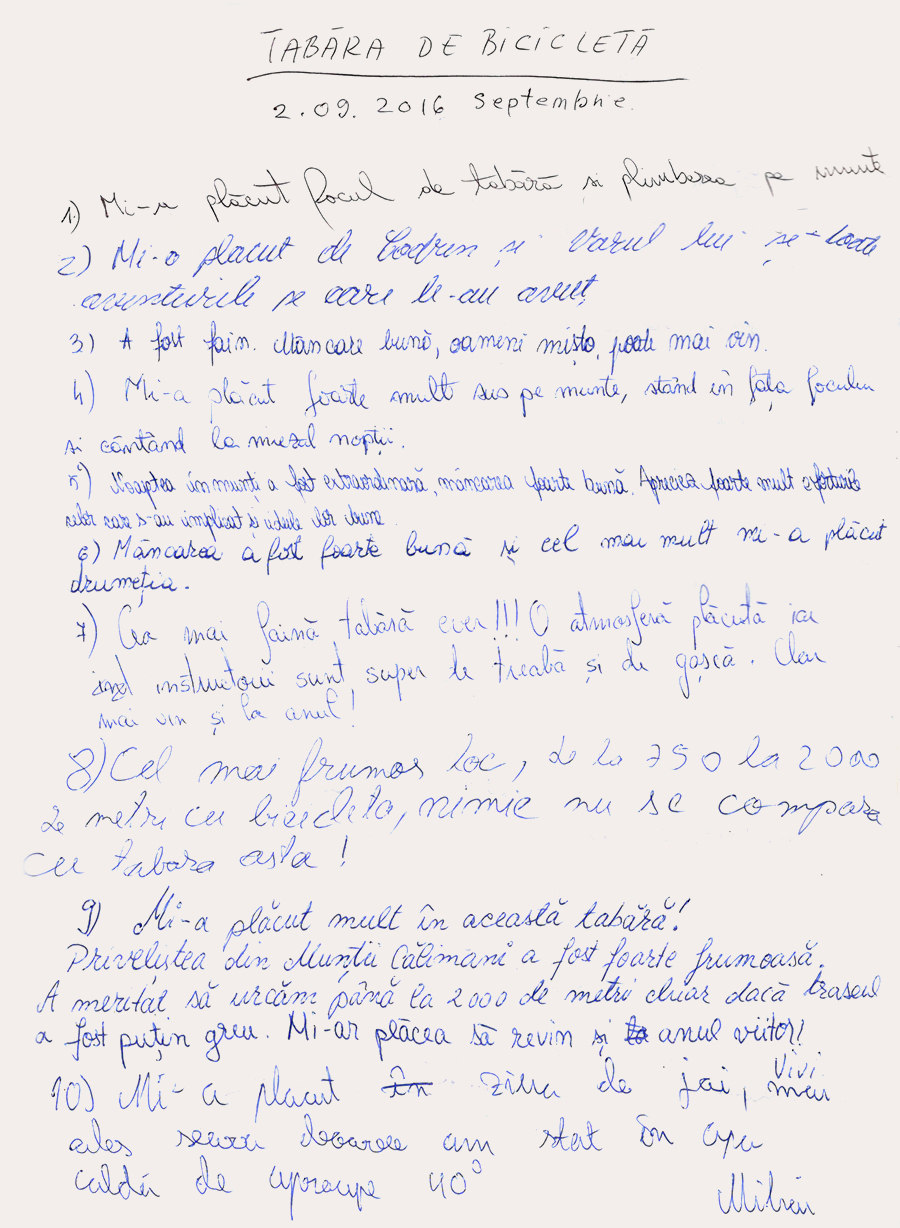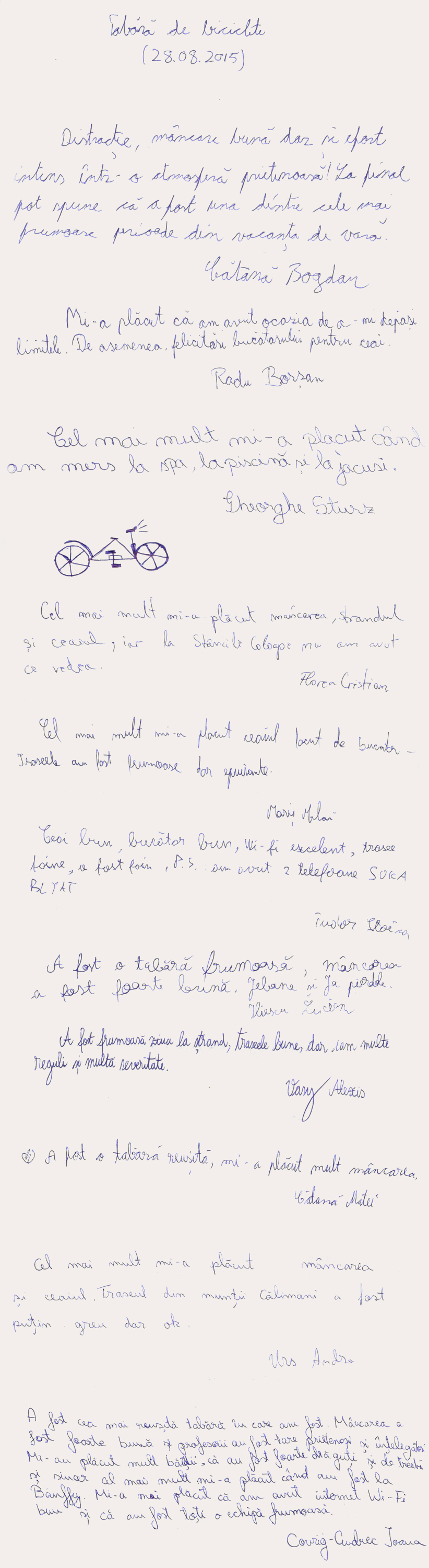 În tabăra de biciclete copii între vârstele de 10 și 18 ani sunt împărțite în 2 grupuri: easy ride și hard ride. Grupul easy ride este pentru cei care încă nu au experiență pe trasee mai dificile. Cu ei instructorii vor parcurge trasee mai ușoare. Grupul hard ride o să petreacă mai mult timp pe cărări montane care necesită practică. Programul include cărări montane până la Stâncile Coloape (20km), Biserica din Lemn (10km), Lacul Iezer (60km) condimentate bineînțeles cu bălăceală și jocuri tematice, ieșiri la ștrand. Seară de seară protagonistul principal o să fie jocul și voia bună. Programele de după-masă includ vizitarea Cascadei Termale din Toplița sau a altor obiective turistice. La fel, în funcție de vreme, în ultima seară a taberei o să punem cireașa pe tort cu un foc de tabără ce ajunge până la cer, cu muzică și dans.